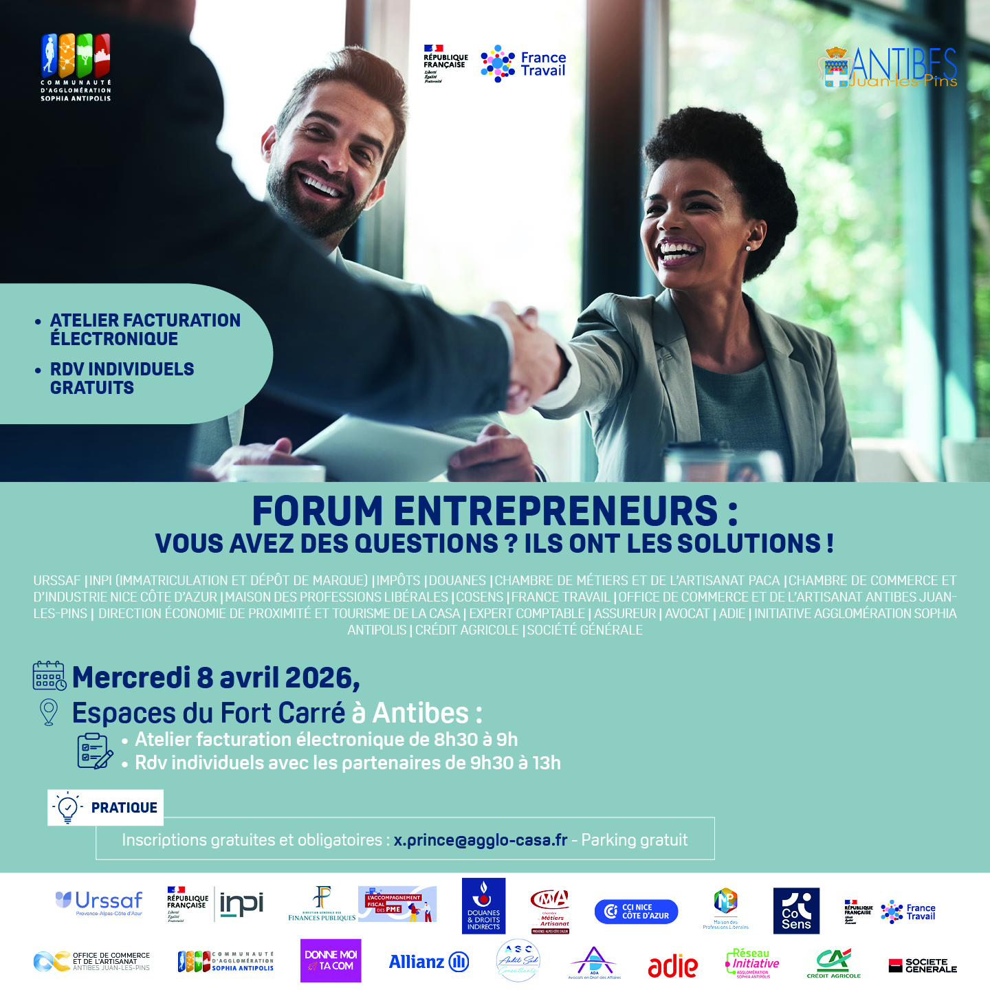 Rejoignez nous le 📆mercredi 8 avril aux Espaces du Fort Carré d'Antibes Juan-les-Pins de 8h30 à 13h et rencontrez 19 partenaires 🤝 incontournables de la création d'entreprise.
